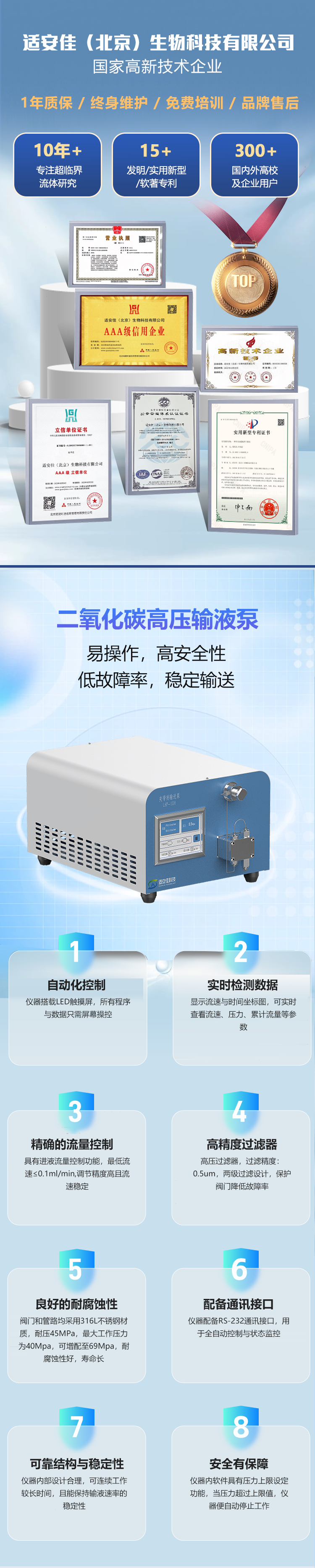 壓力:0-20MPa,流速:0-100ml/min,500ml內置前置制 冷罐,7寸觸摸屏操作,壓力上限設置,恒流恒壓輸送模 式